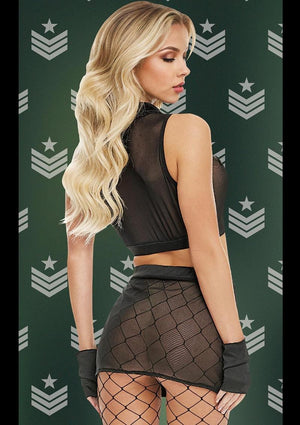 Get ready to lead the chargeSergeant Seduction is reporting for duty. Salute in style with the commanding Sergeant Seduction 4-piece lingerie set in bold black. Designed to turn up the heat, this edgy look features a sheer, cropped mesh top with a lace-up front and classic collar, accented with a gold wing patch for that official touch. The mini skirt stuns with fishnet paneling and a faux-button front, giving just the right mix of authority and allure. Fingerless gloves add the perfect finishing touch to this powerful look. Whether you`re calling the shots or playing by your own rules, this seductive uniform guarantees a night of unforgettable action. Available in One Size Fits Most and Queen Size for a fierce and flattering fit.